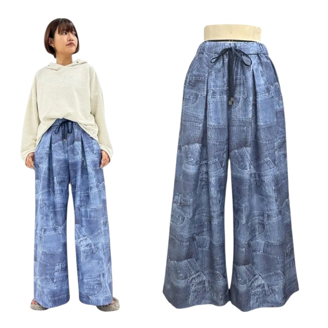 デニムパンツのパーツを転写プリントされた個性的な印象のボトムです。