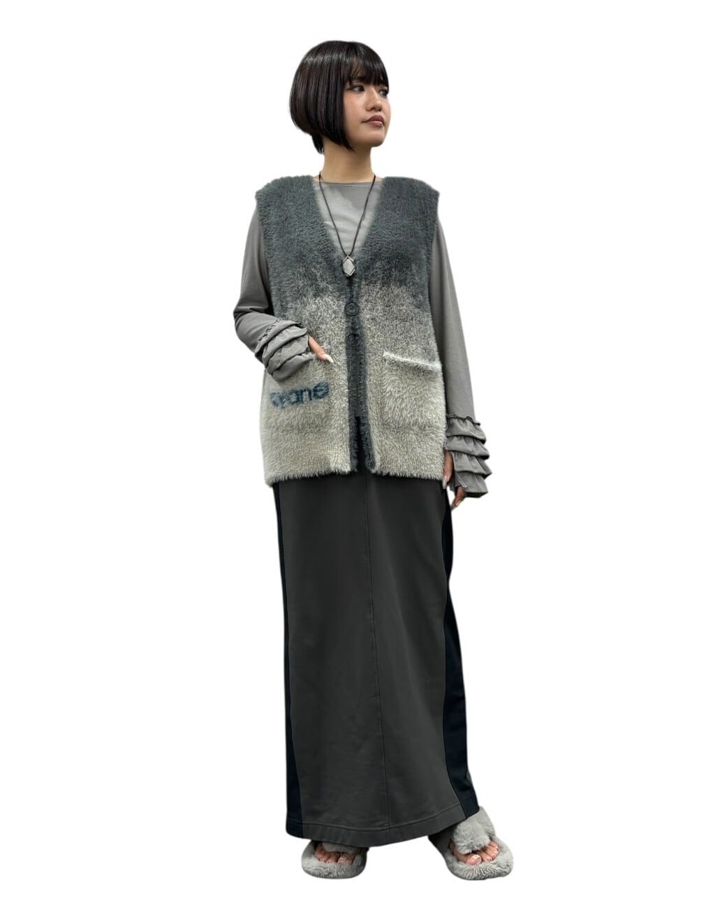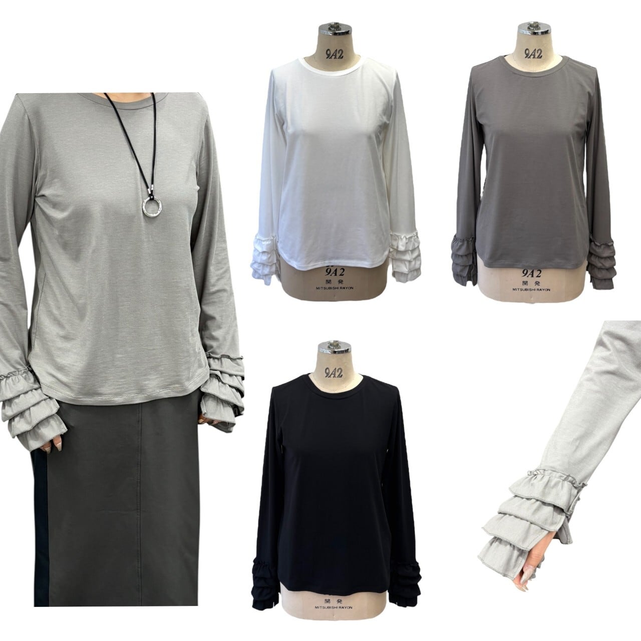 気持ちの良い素材もさることながら、インナーとして着用した時の、袖口から出てくるフリルのレイヤードがとても印象的。