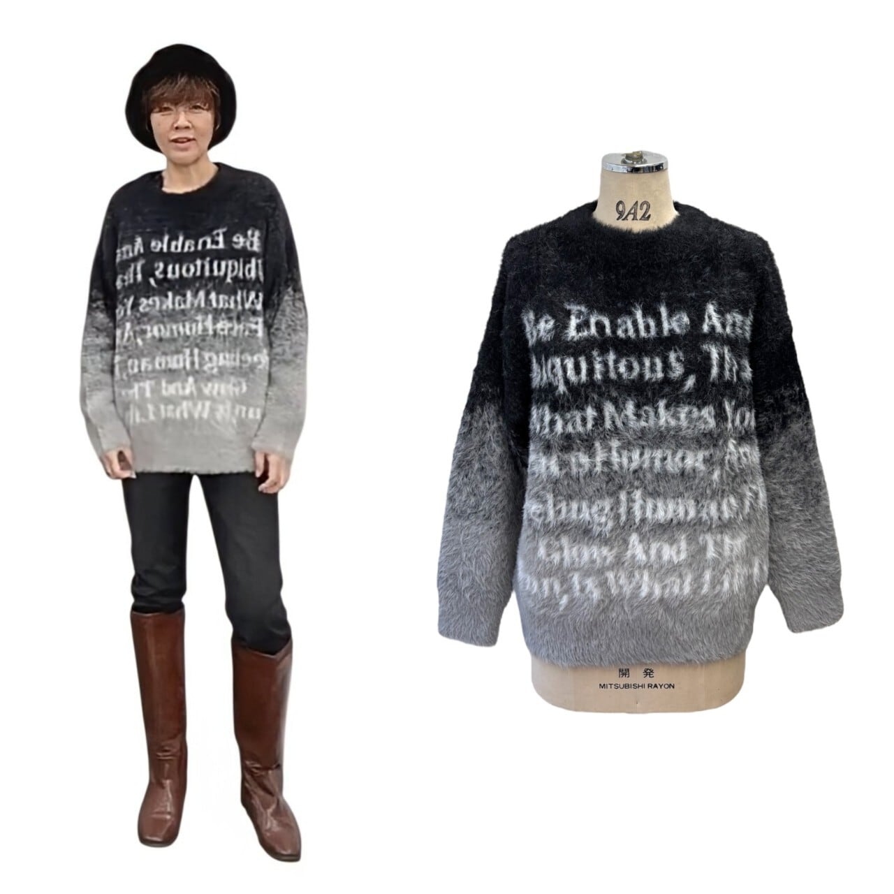 シャギー糸でグラデーションを表現し、ロゴを前身全体に配置したクールな印象のカジュアルニットです。