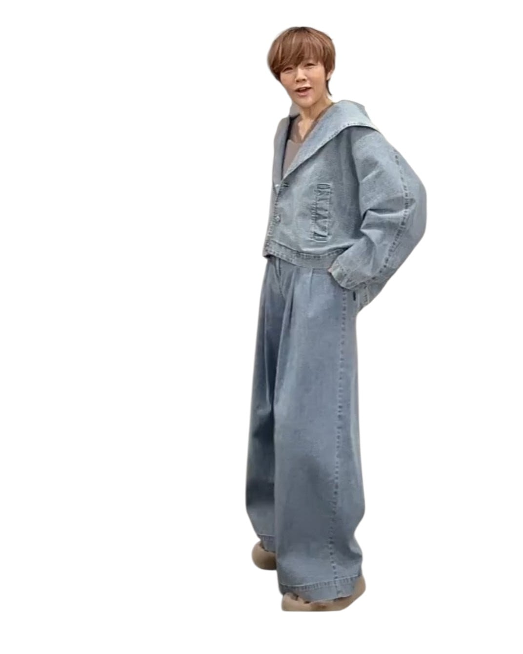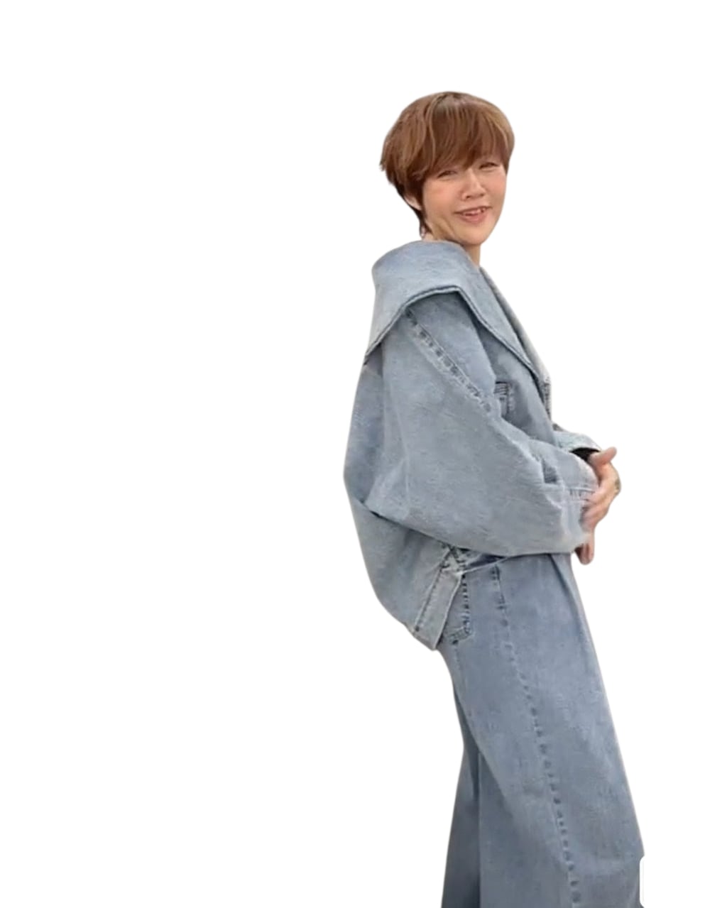 大きめのショールカラーのジャケットで、少し後ろに抜いた感じ着用していただくと、かわいいシルエットで着こなせます。
