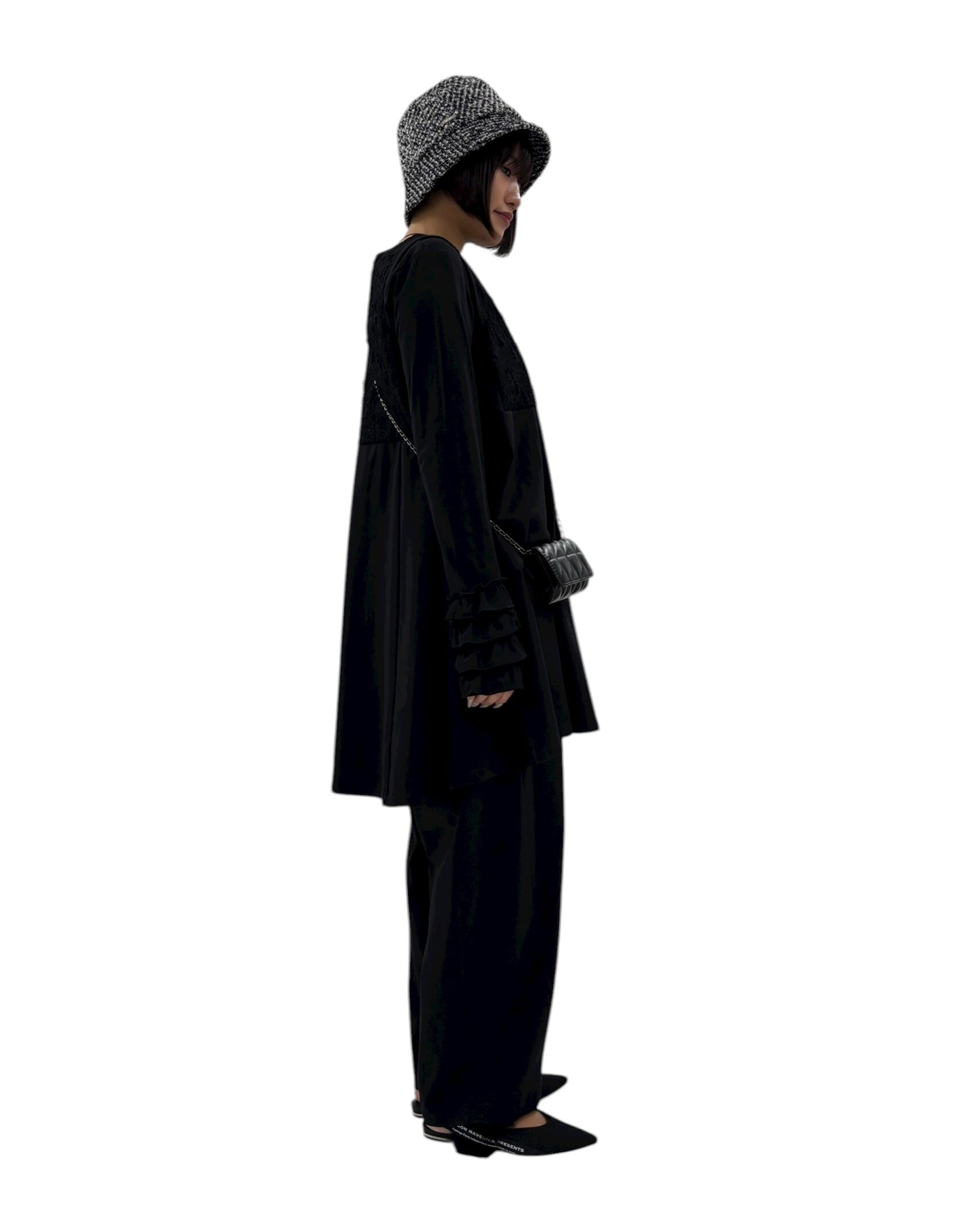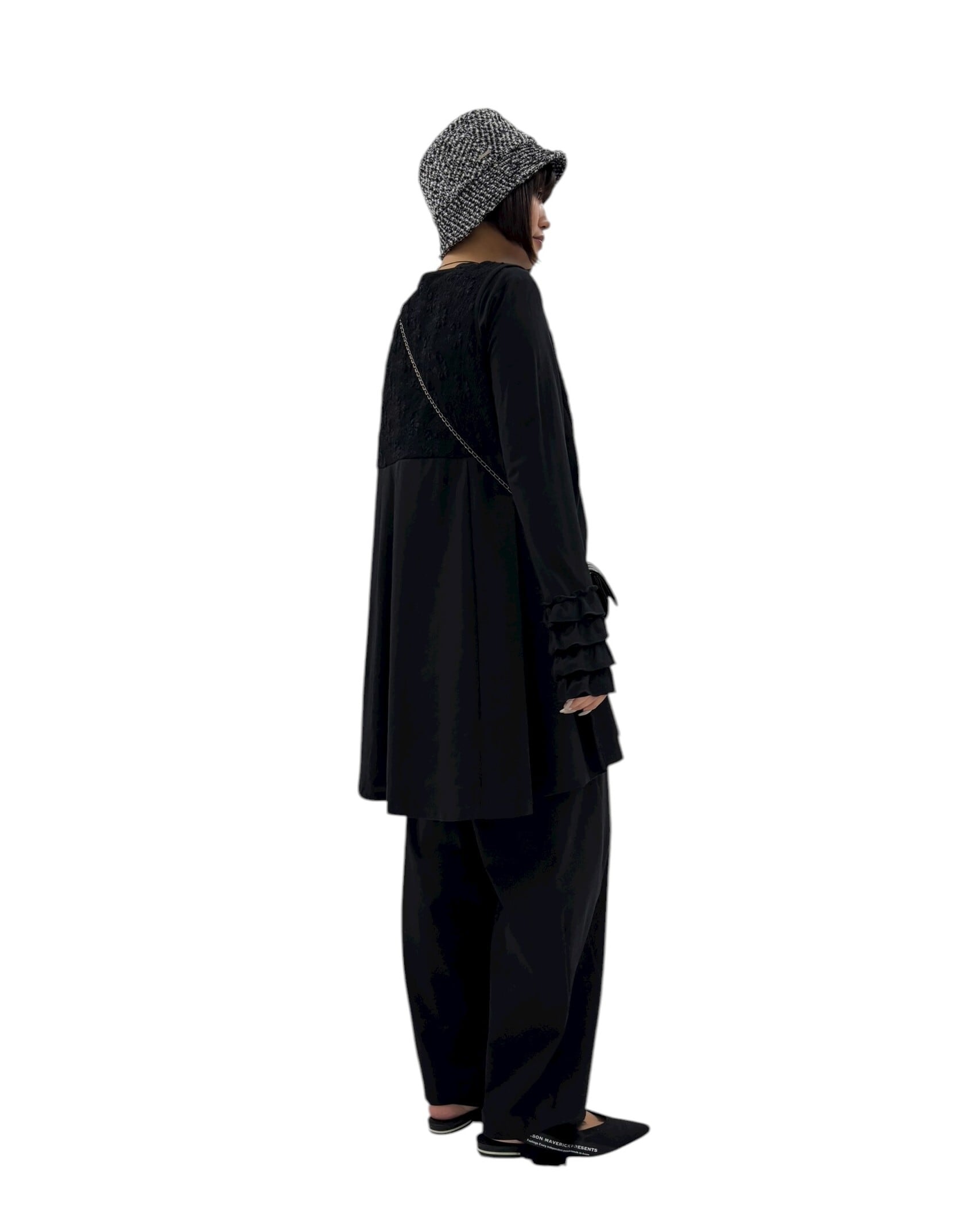 レースを重ねて表情を作ることによって、セットアップコーデも引き締まって見えます。