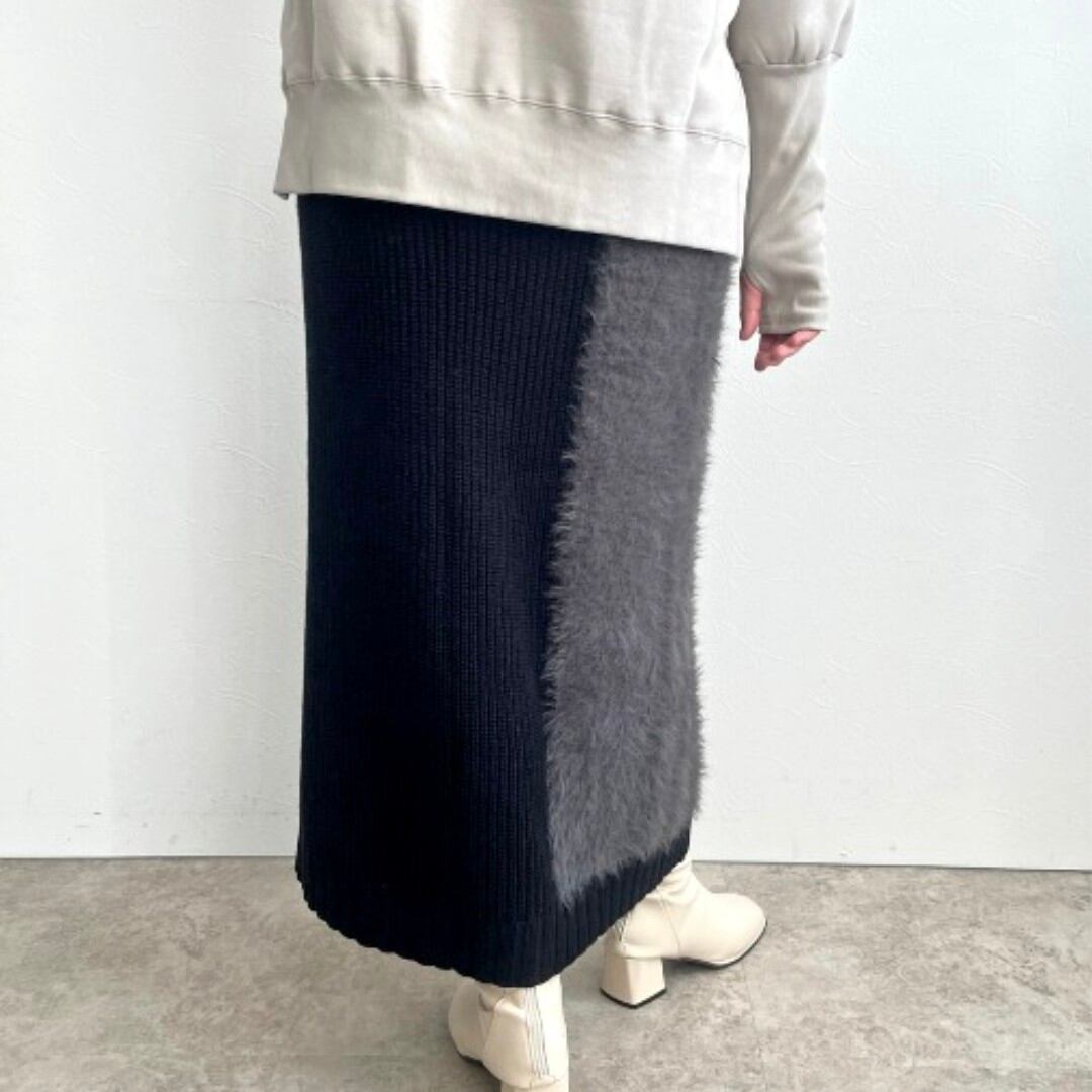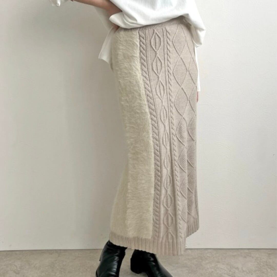 立体的な編地変化ニットとフェザー切替が着映えするニットスカート。