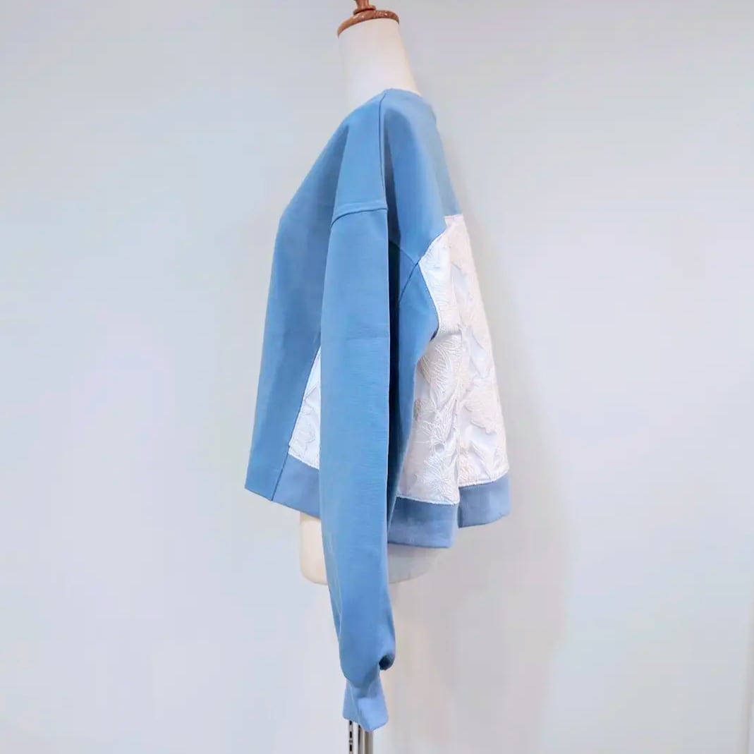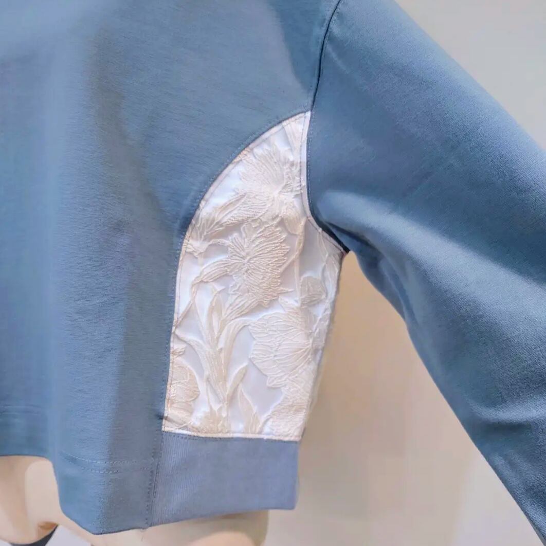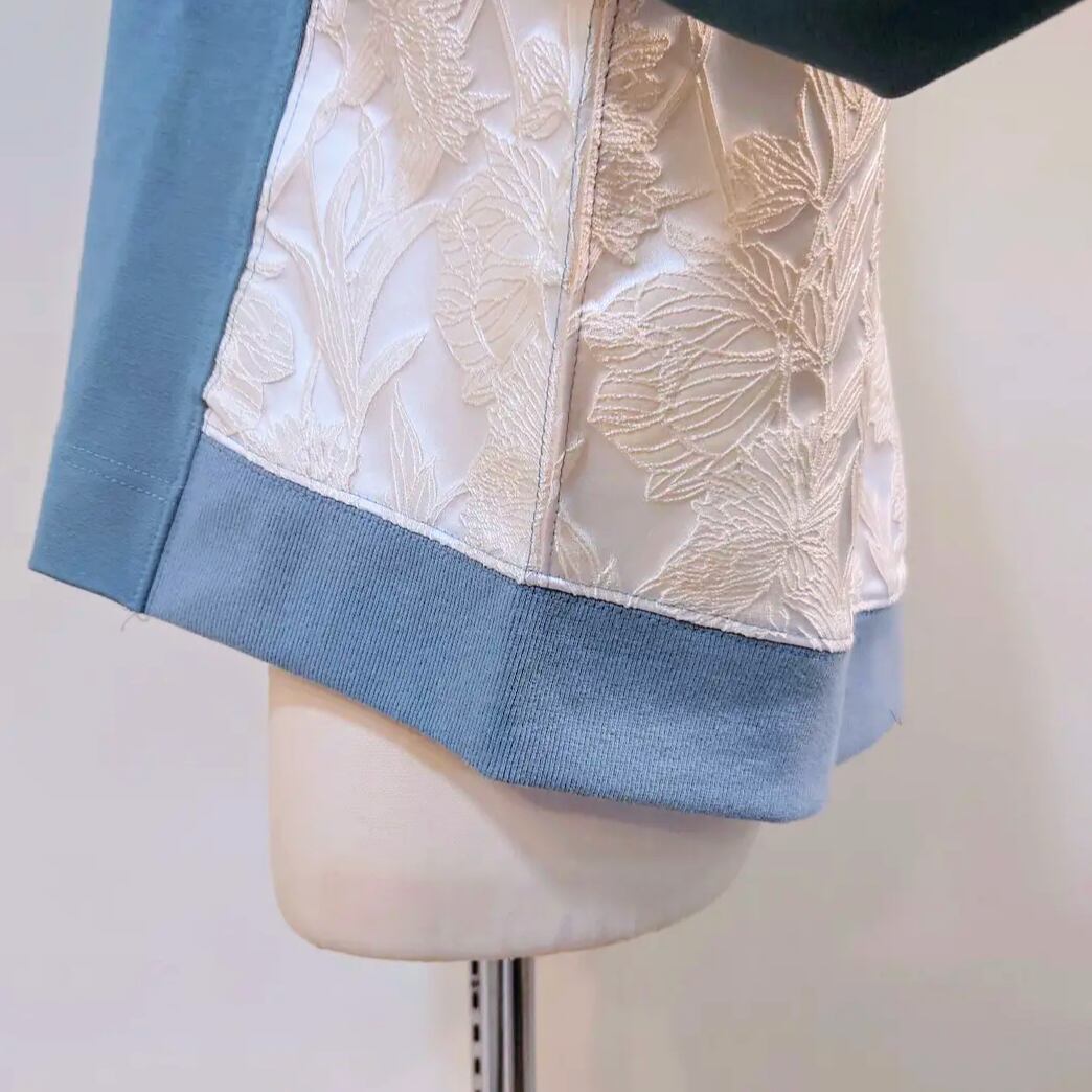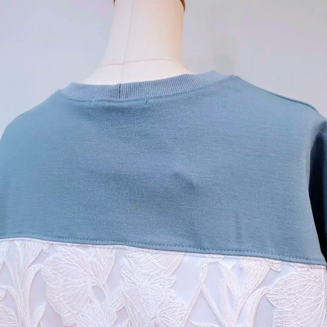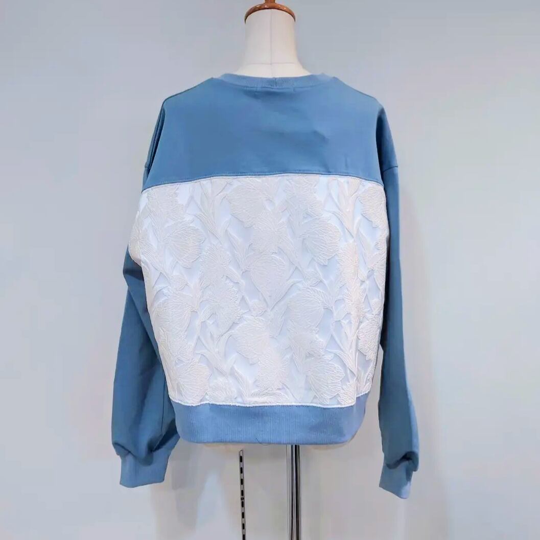 花刺繍の布帛の切替がポイントのプルオーバー。