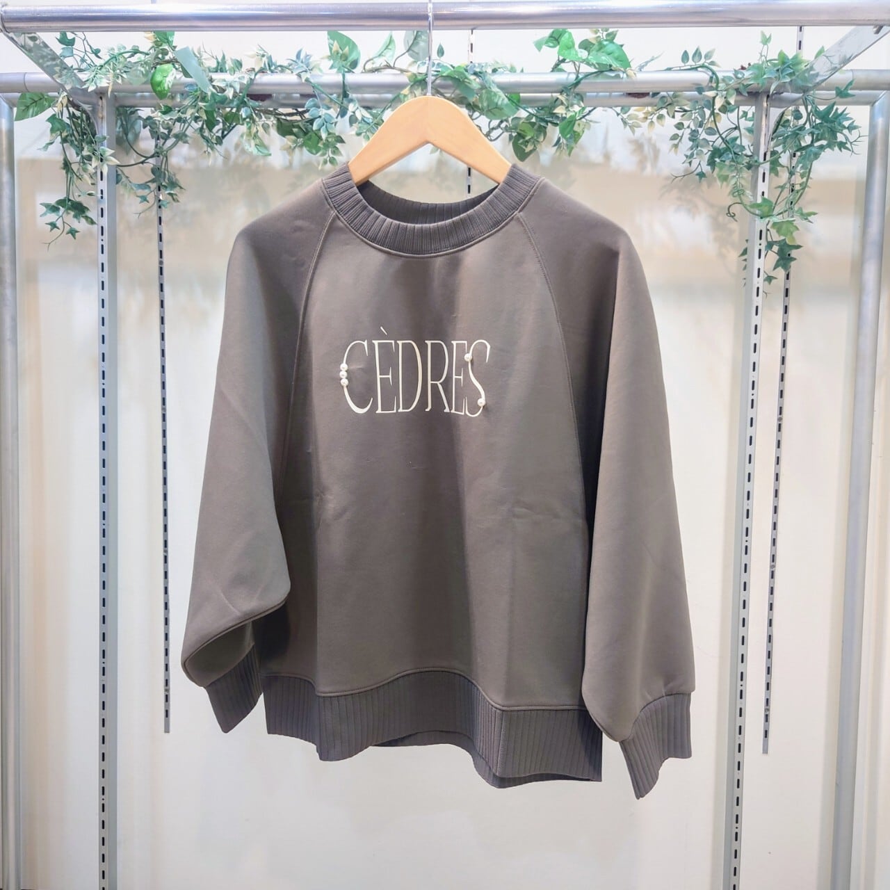 シンプルなロゴにパールがアクセントになるトップス。